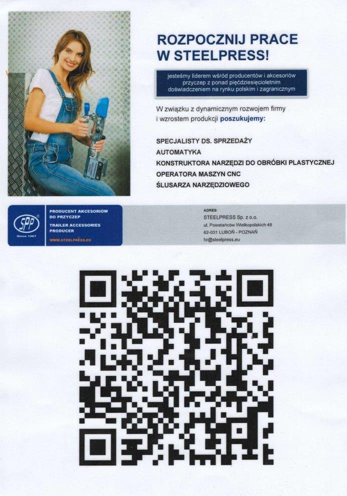 Współpracująca ze szkołą Firma Steelpress z Lubonia ze względu na dynamiczny rozwój produkcji poszukuje osób do pracy na stanowiska: