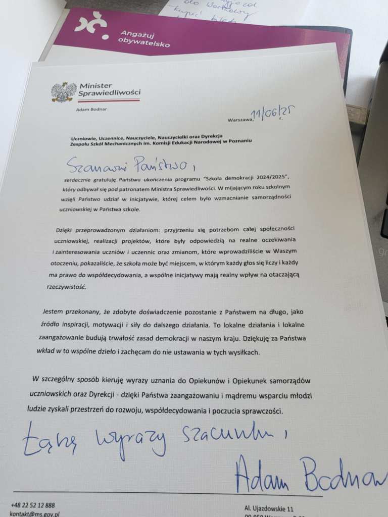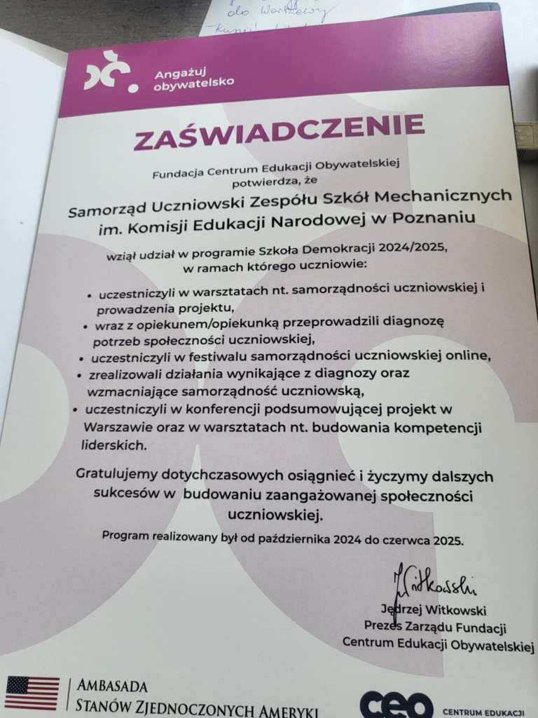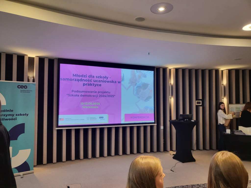 Samorząd Uczniowski uczestniczył w tym roku w ogólnopolskim projekcie zorganizowanym przez CEO „Szkoła Demokracji”. Nasz projekt „Balans- Relaks”- przyczynił się do zakupu miodowej kanapy do wypoczynku oraz gier, z których można skorzystać podczas przerw. 12 i 13 czerwca reprezentanci Samorządu Uczniowskiego wraz z opiekunem, p. Moniką Ograbek, uczestniczyli w konferencji „Młodzi dla szkoły- Samorządność uczniowska w praktyce”. Dzięki temu wzbogacili się o kolejne pomysły do działań, by w szkole każdy czuł się coraz lepiej.