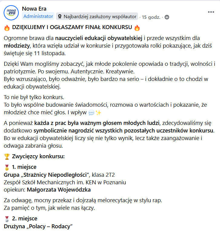 Z przyjemnością informujemy, że grupa uczniów z klasy 2T2, którym liderowała Julia Plaskata, zwyciężyła w konkursie na najlepszą rolkę pt. „Masz wpływ na to, jak świętujesz – Dzień Niepodległości oczami młodych”