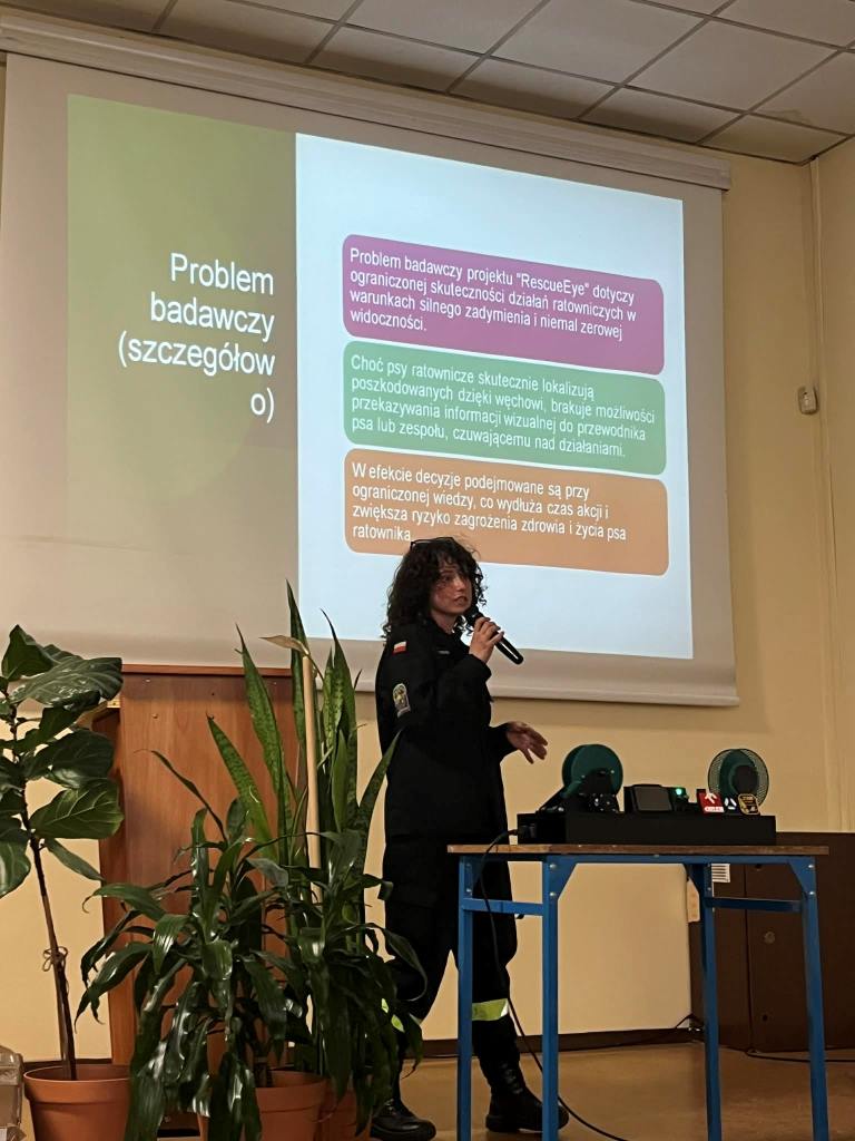 Projekt RescueEye to system wspierający działania ratownicze poprzez wykorzystanie technologii termowizyjnej dla ratowniczych psów poszukiwawczych. Umożliwia szybkie wykrywanie osób w trudnych warunkach, takich jak zadymienie czy ograniczona widoczność. Dodatkowo system integruje funkcje komunikacyjne ratownik-pies, co pozwala na sprawniejszą koordynację akcji ratunkowych.