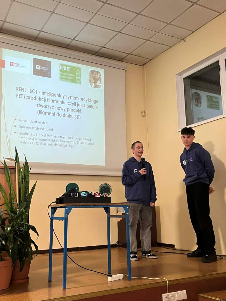 REFILL BOT to system umożliwiający przetwarzanie zużytych butelek PET na filament do drukarek 3D. Rozwiązanie to wpisuje się w ideę gospodarki obiegu zamkniętego i redukcji odpadów plastikowych. Projekt pozwala na ponowne wykorzystanie materiałów i tworzenie nowych elementów przy użyciu technologii druku 3D.