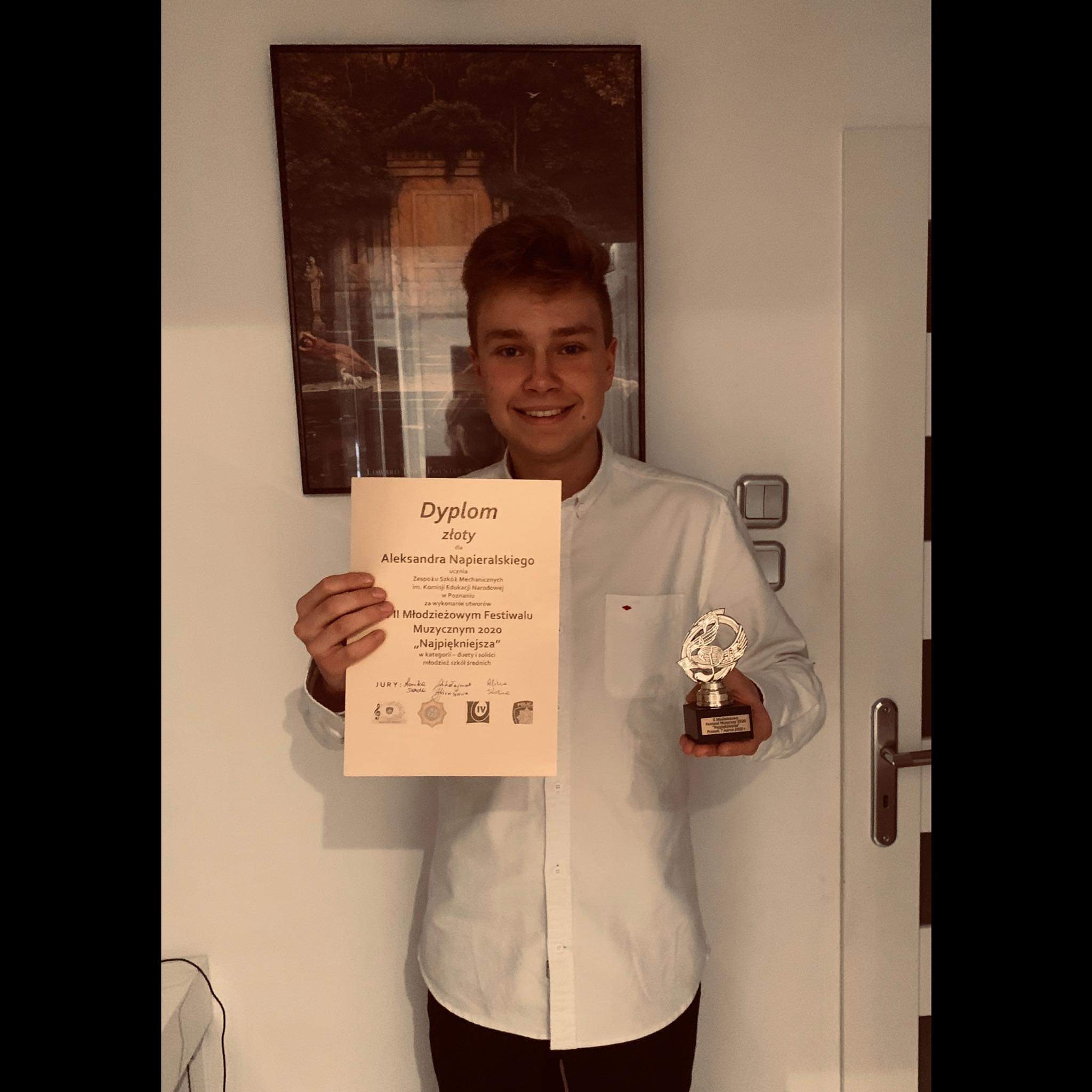 Z dumą informujemy, że uczeń klasy 1PO4 Aleksander Napieralski „wyśpiewał” złoty medal na II Młodzieżowym Festiwalu Muzycznym 2020 „Najpiękniejsza”, który odbył się 7 marca w Poznaniu. Aleks wykonał utwory „Believer” Imagine Dragons oraz „Rise Like a Phoenix” Conchity Wurst i pokonał bardzo mocną konkurencję.