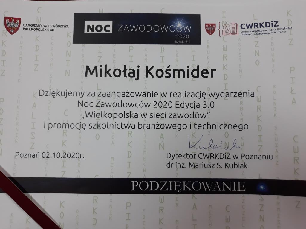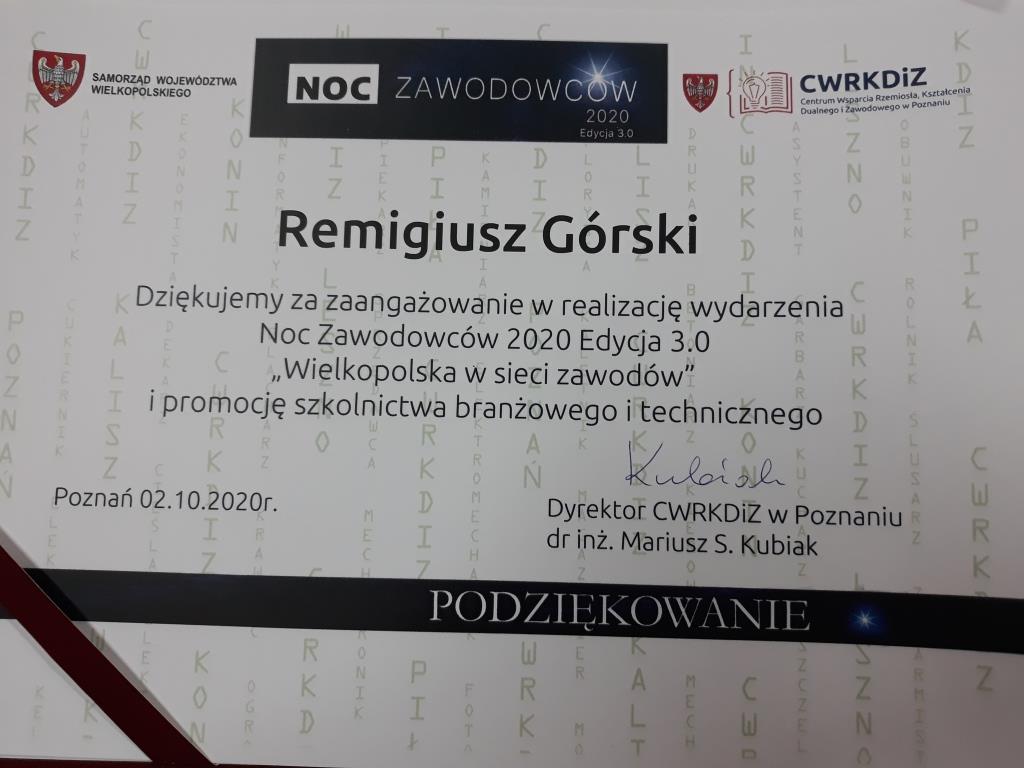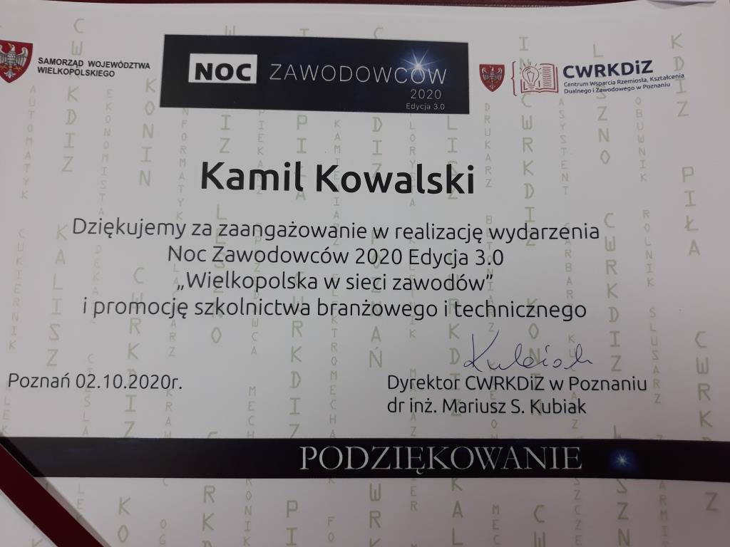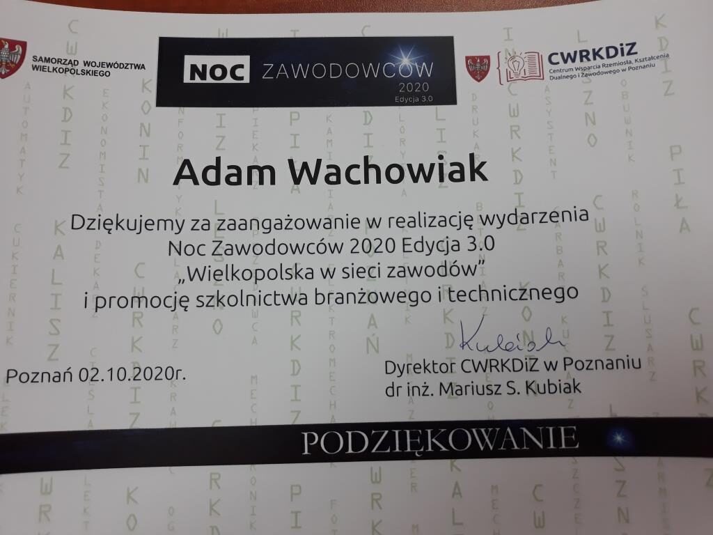2 października 2020 roku odbyła się kolejna edycja Nocy Zawodowców. Czas pandemii wymusił jednak zmianę jej formy. Tegoroczna edycja wydarzenia odbyła się w wersji online. Poszczególne placówki miały okazję zaprezentować zawód, którego można się uczyć w wybranych szkołach i ośrodkach. Miło nam tą drogą poinformować, że w wydarzeniu wzięli udział także uczniowie naszej szkoły, którzy podczas tegorocznej Nocy Zawodowców zaprezentowali przygotowany przez siebie film, przybliżający wszystkim uczestnikom arkana zawodu mechatronika. Prezentacja tego zawodu dokonała się w ramach preorientacji zawodowej i była dla innych uczestników spotkania okazją do poznania tajników tego właśnie zawodu przyszłości. Film przygotowany został przez Kamila Kowalskiego, Adama Wachowiaka, Remigiusza Górskiego i Mikołaja Kośmidra, którym serdecznie gratulujemy stworzenia prezentacji wybranego przez siebie kierunku kształcenia. Zachęcamy też innych do przygotowania wizualnych materiałów dotyczących wybranych przez siebie zawodów oraz przedstawiania w nich swoich pasji i zainteresowań.