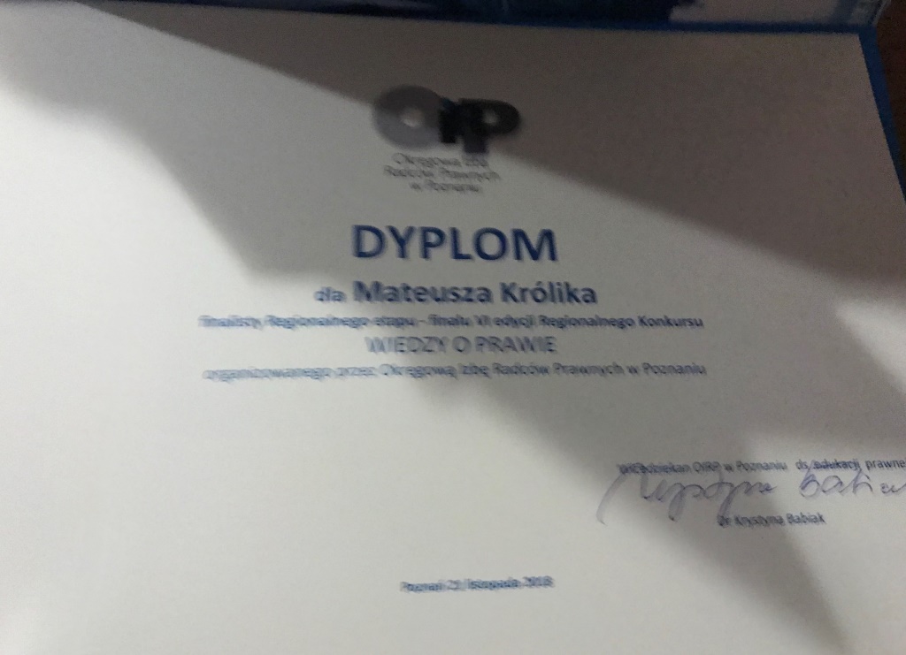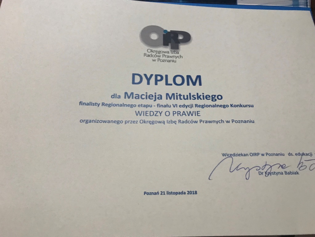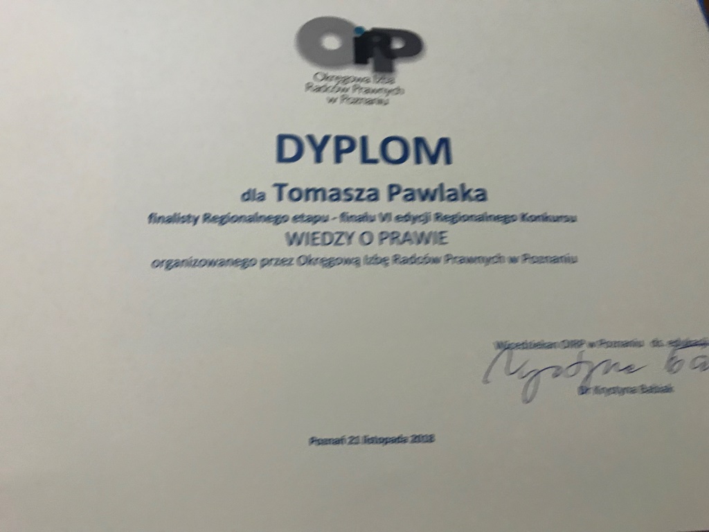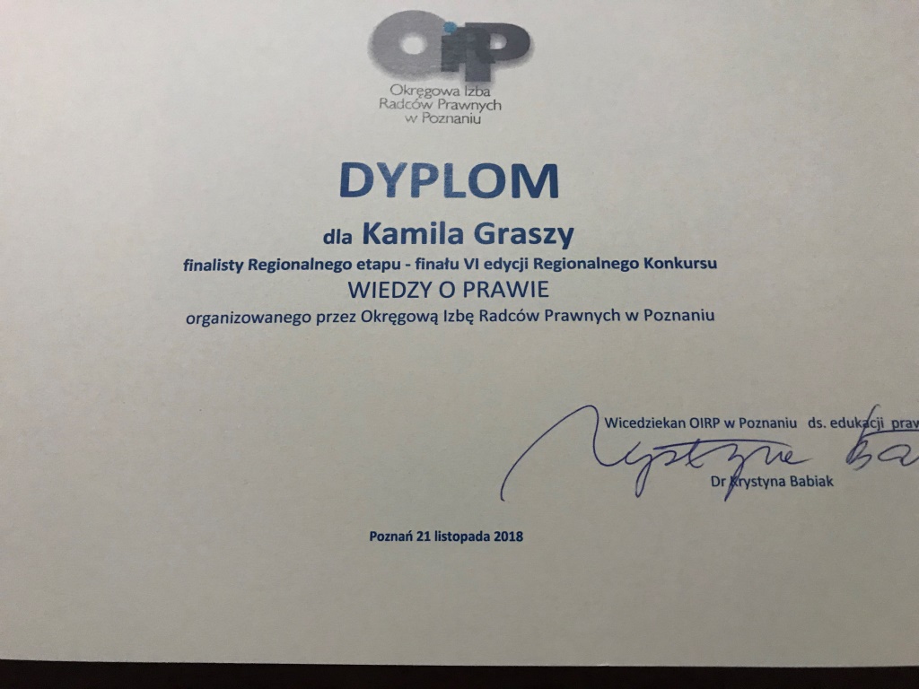 WYRÓŻNIENIE W VI EDYCJI REGIONALNEGO KONKURSU WIEDZY O PRAWIE